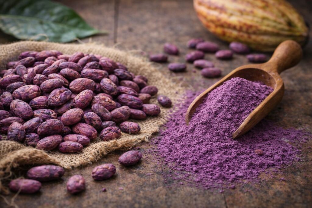 Distinctive violet cocoa derivatives processed from Ecuadorian beans, naturally expressing a unique coloration that results from the presence of polyphenols preserved through a controlled fermentation process.